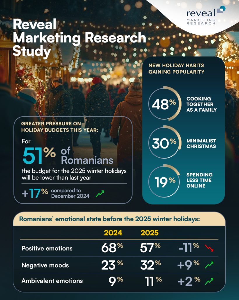 - 57% of Romanians welcome the winter holidays with positive feelings, a percentage down by 11% compared to December 2024.