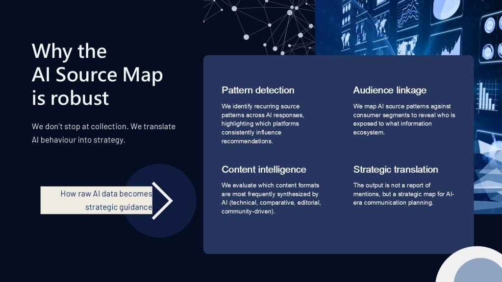 Prin agregarea acestor rezultate se construiește o hartă a ecosistemului de informații care influențează recomandările AI într-o categorie și poziția pe care o ocupă diferitele branduri în acest mecanism.