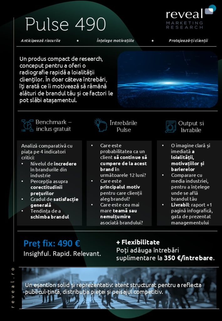 Pulse 490 este un studiu cantitativ rapid, realizat pe un esantion reprezentativ, conceput pentru a oferi o imagine clara asupra nivelului de loialitate al clientilor. Studiul analizeaza cat de loiali sunt clientii unui brand, ce ii motiveaza sa ramana si ce factori pot declansa migrarea catre concurenta.